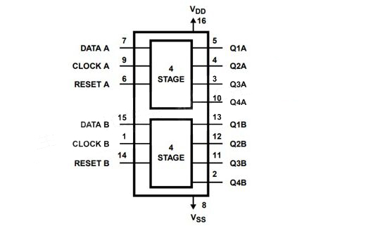 4.Control pins: CD4015 has some control pins, the main ones are the clock (CLK) and data storage (DS) pins.